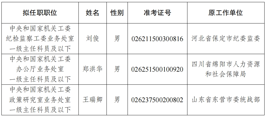 根据2026年度中央机关公开遴选工作有关要求,经过笔试、面试、体检和考察等程序,经研究,确定刘俊等3名同志为中央和国家机关工委公开遴选公务员拟任职人员,现予以公示。公示期间如有问题,请向中央和国家机关工委组织部反映。